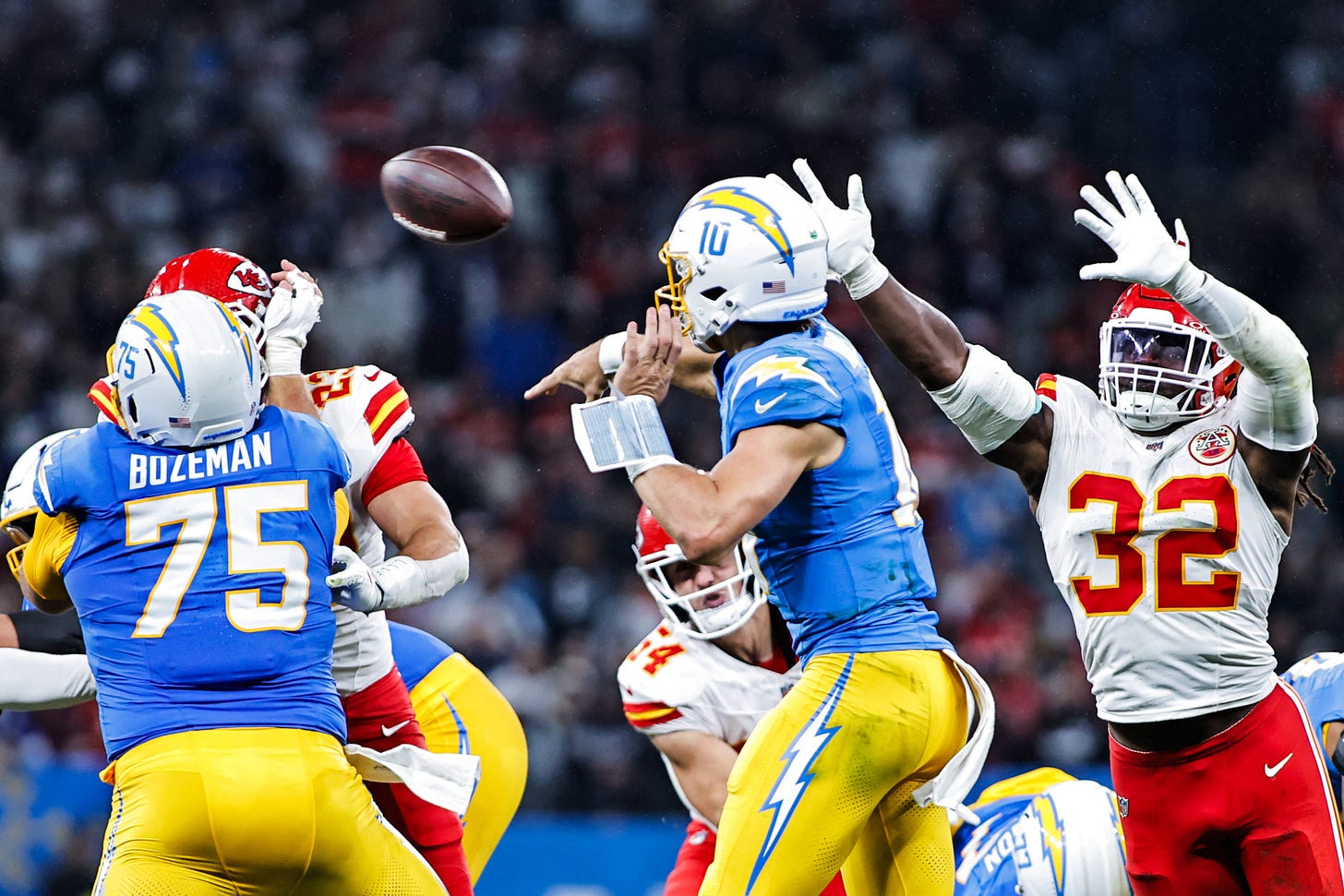 Die Offensive Line der Chargers ist weiter angeschlagen, Chris Jones hatte gegen die Texans ein richtig gutes Spiel und Justin Herbert ist auch nicht bei 100 Prozent. Eigentlich müsste DC Steve Spagnuolo gegen die Chargers den Druck so stark erhöhen wie möglich. Wenn Justin Herbert nicht gerade gegen Blizes so gut aussehen würde. Er hat in dieser Saison ein 101.9 Passer Rating, wenn mehr als vier Verteidiger auf ihn zu stürmen.